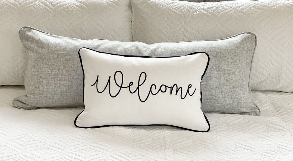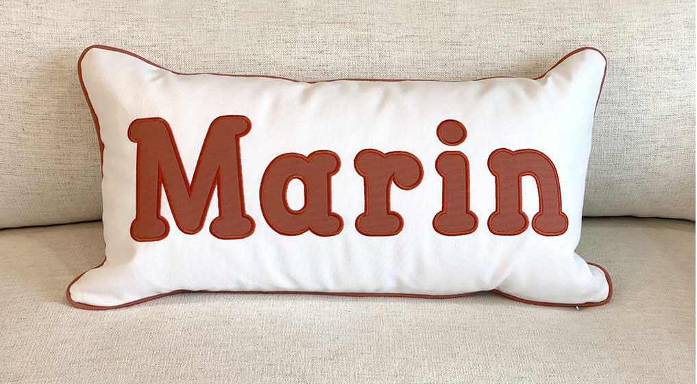 Our pillows can be made by selecting from our range of fabrics, threads and applique fabric colors – in the size you want, with a font you like and created with care, quality and love.