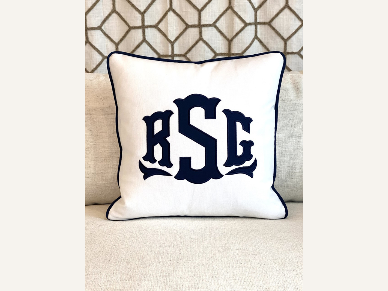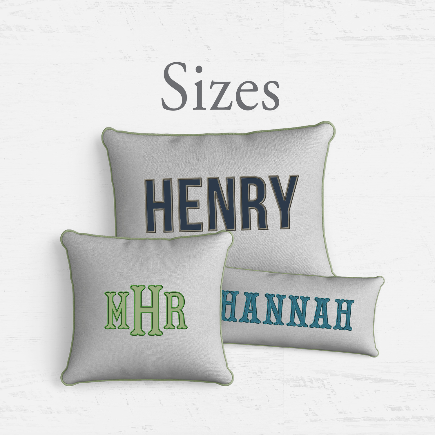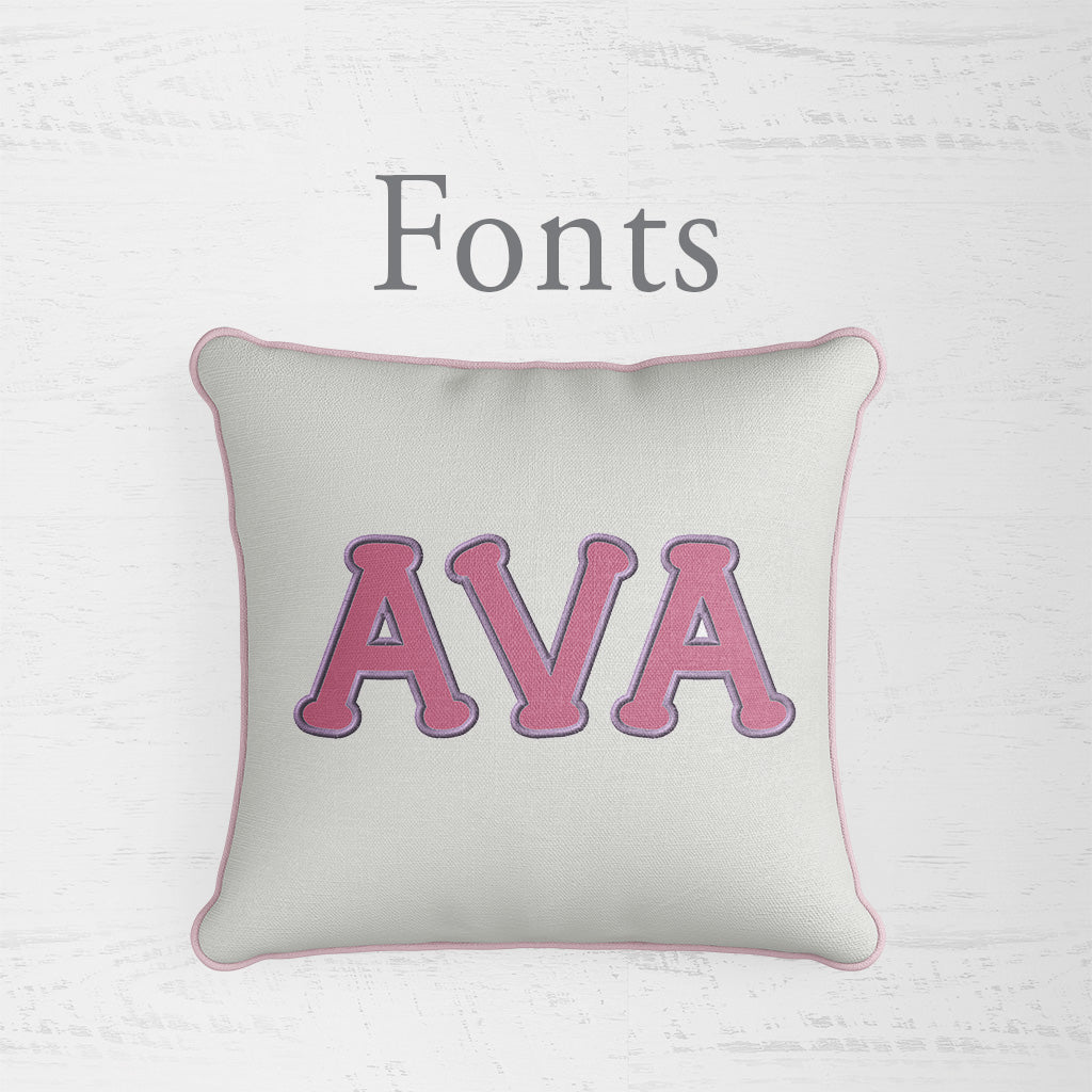 Our pillows can be made by selecting from our range of fabrics, threads and applique fabric colors – in the size you want, with a font you like and created with care, quality and love.