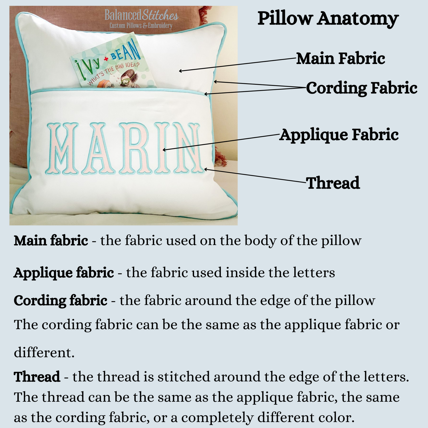 *Names up to 7 letters fit easily on this size pillow. Longer names can be accommodated, but the height of the font will need to be adjusted accordingly. Please contact me to discuss.