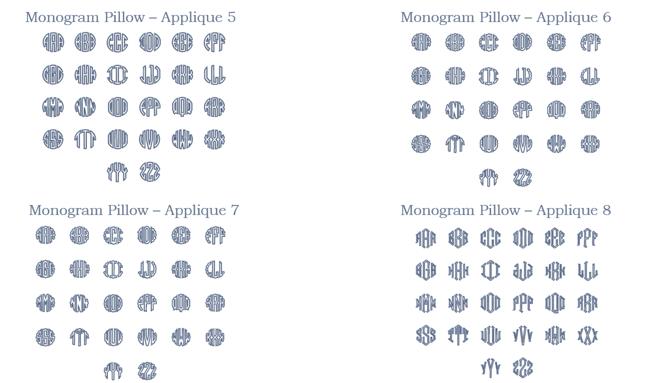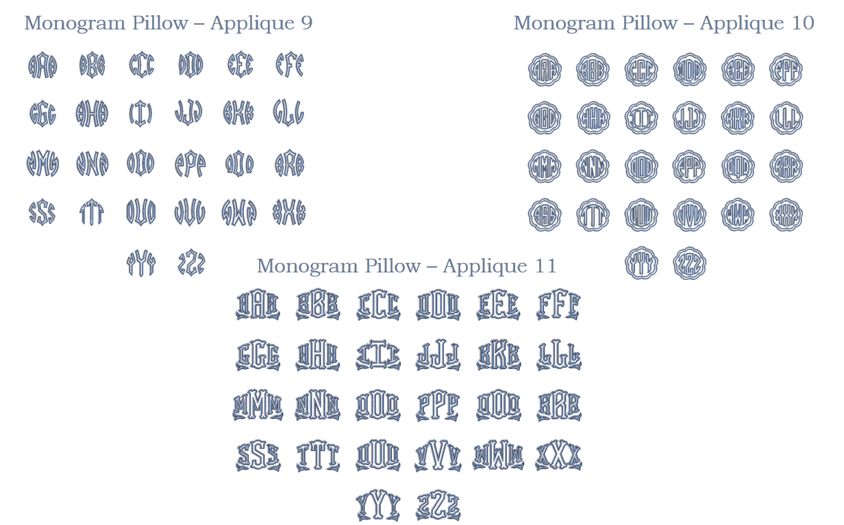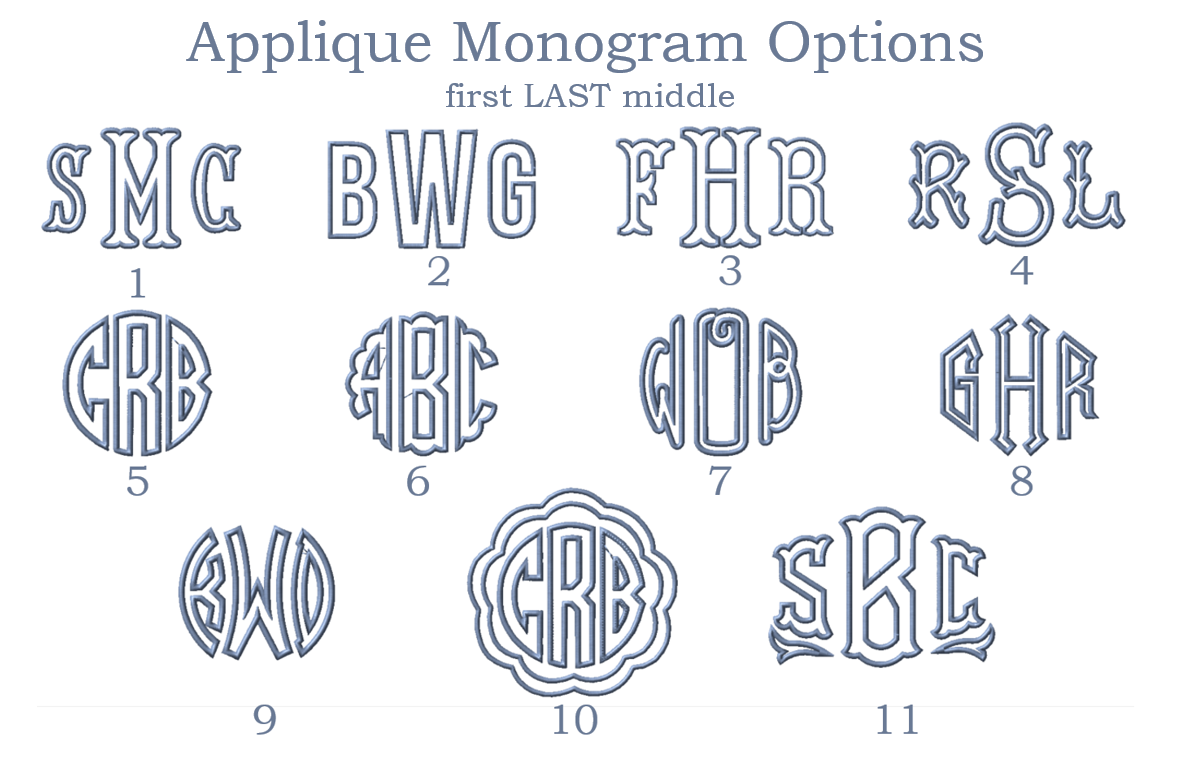 - Full alphabets for each font can be viewed under the FONTS tab - Monogram Applique or Linear Monogram Applique